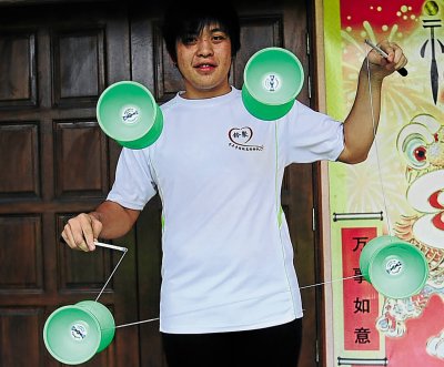 扯铃可说是传统民俗技艺表演的“常客”。据说,要学的话也不难,只需拿着两根连接着绳子的棒子,把铃的中心缠绕在绳子上,双手握着棒子上下摆动,无须几分钟,你就学会扯铃了。