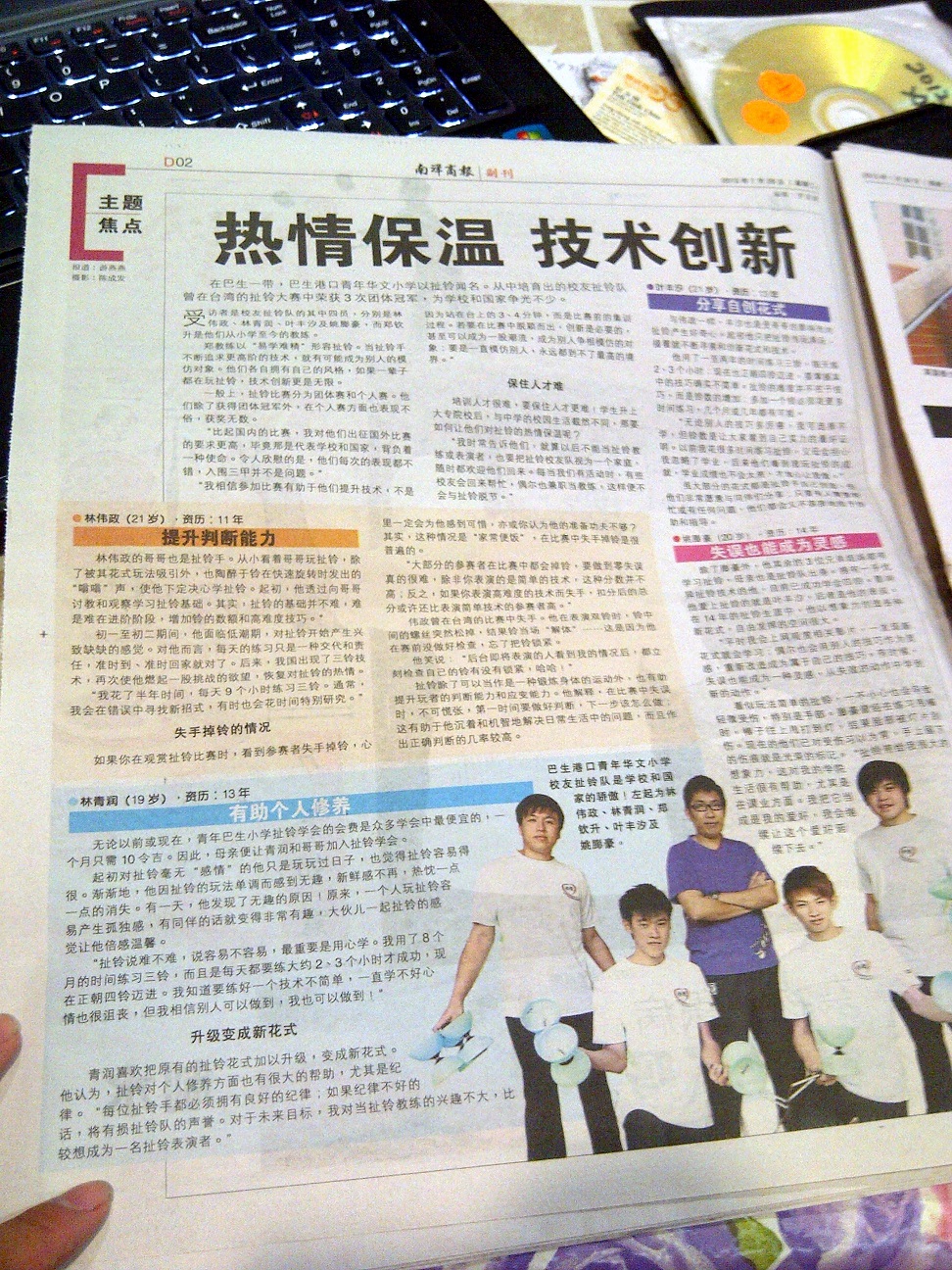 “扯铃说难不难,说容易不容易,最重要是用心学。我用了8个月的时间练习三铃,而且是每天都要练大约2、3个小时才成功,现在正朝四铃迈进。我知道要练好一个技术不简单,一直学不好心情也很沮丧,但我相信别人可以做到,我也可以做到!”