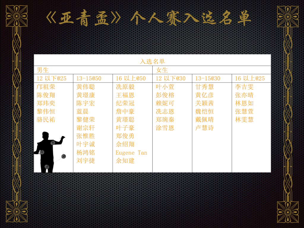 13-15男:黄伟聪、黄璟康、陈宇宏、蓝晨、黎健荣、谢宗轩、张惟胜、叶宇诚、杨鸿铭、刘宇捷